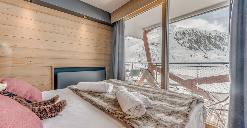 A south-facing bedroom with a bay window opening onto the balcony - a 160200 cm double bed facing the mountain - a wall-mounted TV - a dressing area / wardrobe with full-length mirror.